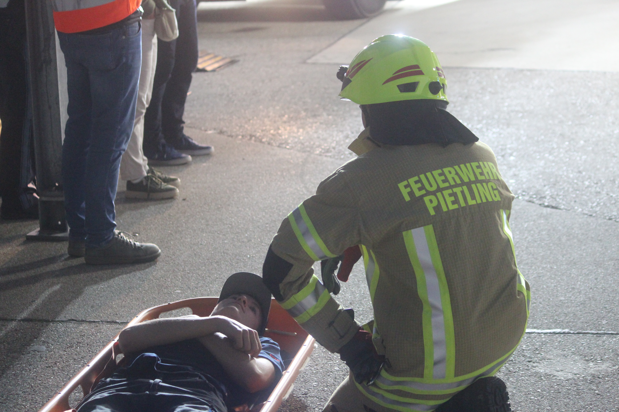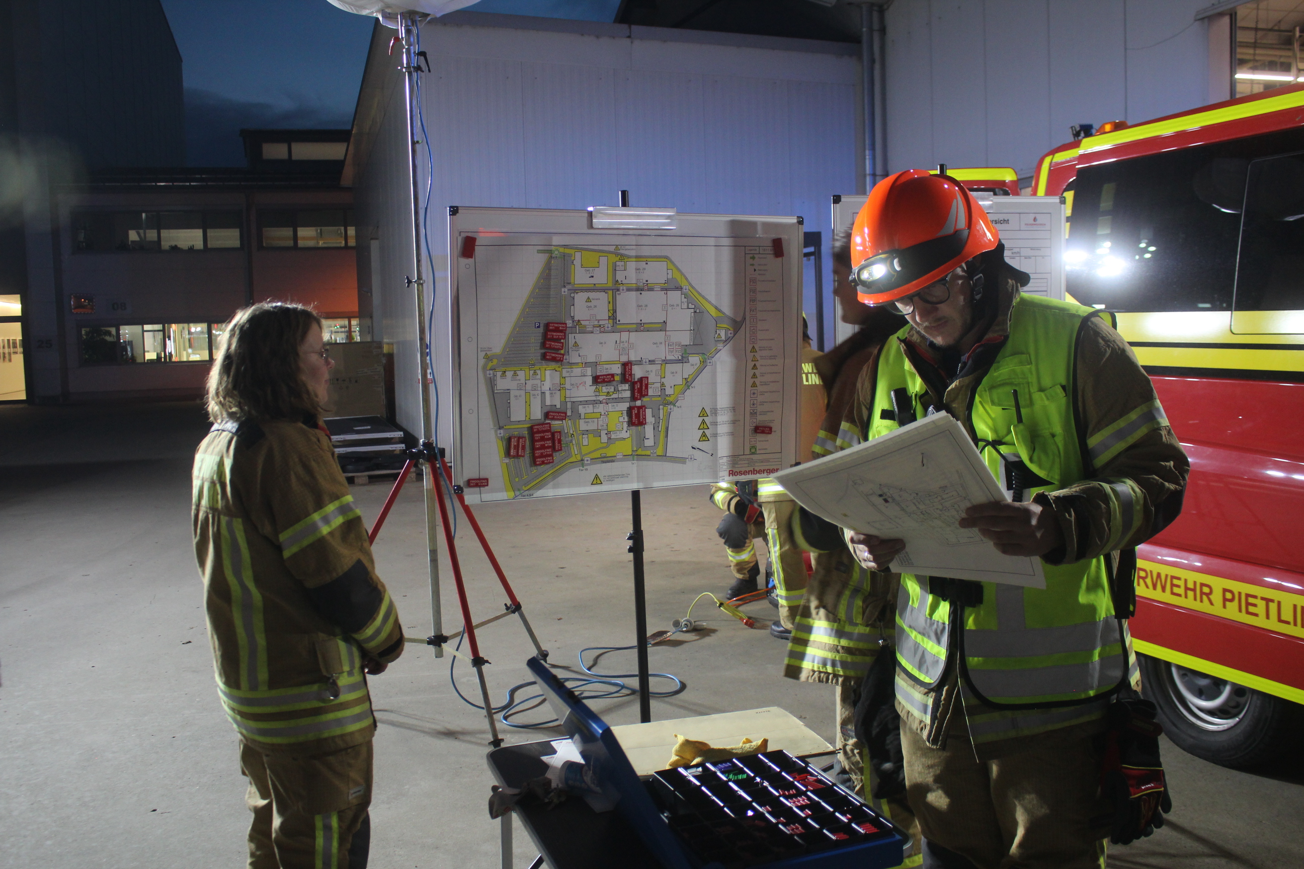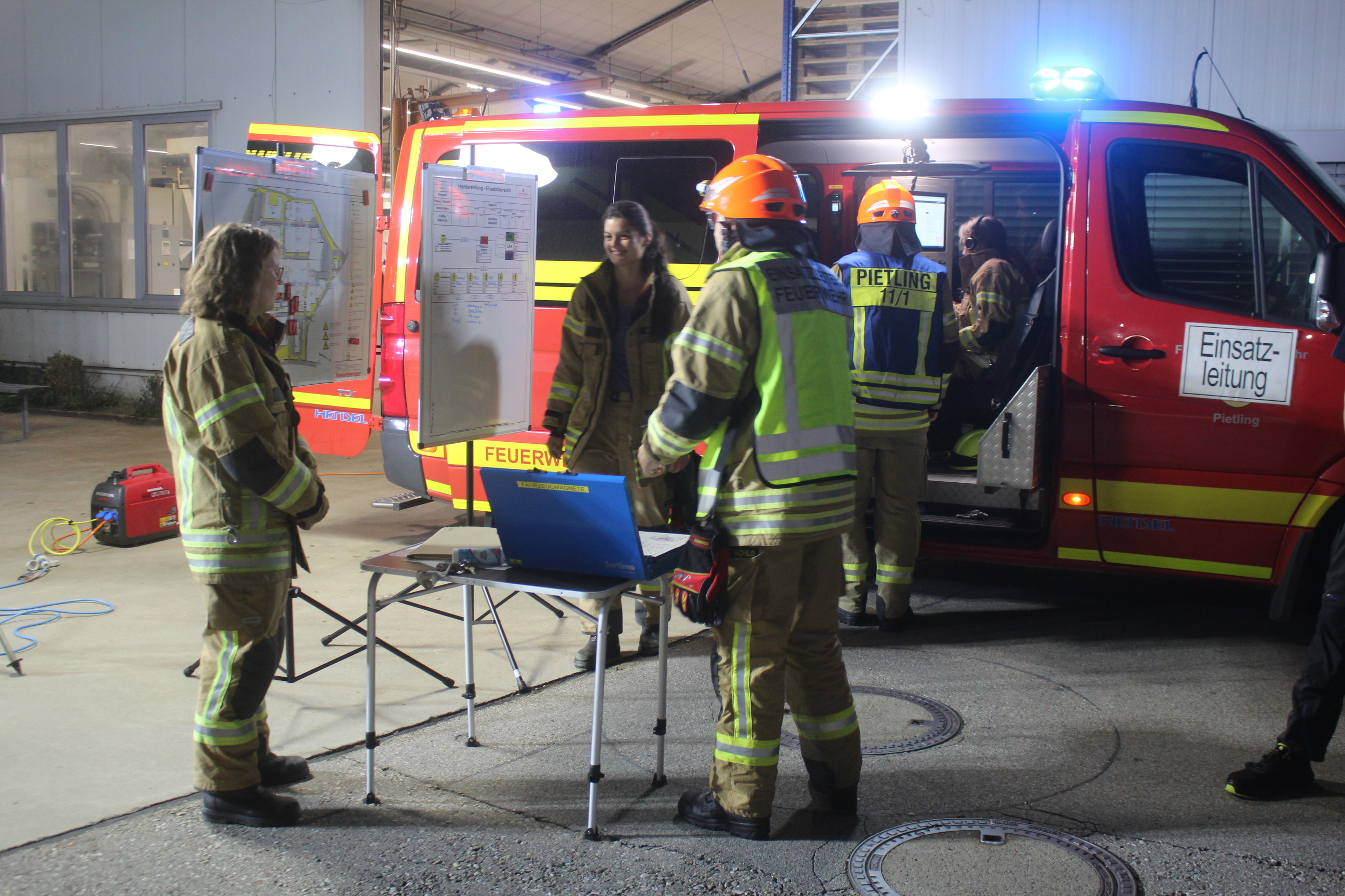 Den umfangreichen Einsatz mit mehr als 160 Feuerwehr-Kräften effektiv zu koordinieren, war für die Einsatzleitung besonders herausfordernd. Pietlings 1. Kommandant Hans Schild und seine beiden Stellvertreter Christoph Huber und Tobi Maier meisterten diese Aufgabe mit Bravour. „Der Raum wurde gut aufgeteilt, in fünf Einsatzabschnitte gegliedert“, lobte Kreisbrandrat Christof Grundner, der zusammen mit weiteren Führungskräften der Kreisbrandinspektion als Beobachter an der Übung teilnahm. Auch Fridolfings 1. Bürgermeister Johann Schild und einige Mitglieder des Gemeinderates informierten sich über den Übungsablauf und die Leistungen der Feuerwehren, ebenso waren Mitglieder der Geschäftsführung und der Unternehmerfamilie Rosenberger vor Ort. Vom Notfall-Team des Unternehmens wurde die Großübung genutzt, um wertvolle Erkenntnisse zu gewinnen und Notfallkonzepte zu überprüfen. So wurden die Werksangehörigen im Vorfeld nicht über die Großübung informiert, um unter realitätsnahen Bedingungen die Evakuierung aus den, vom Brand betroffenen Werkshallen zu üben. Das lief richtig gut. Vier Minuten nach Auslösen der Brandmeldeanlage hatten alle Mitarbeiter die Hallen verlassen und die Rettungstreffpunkte aufgesucht.