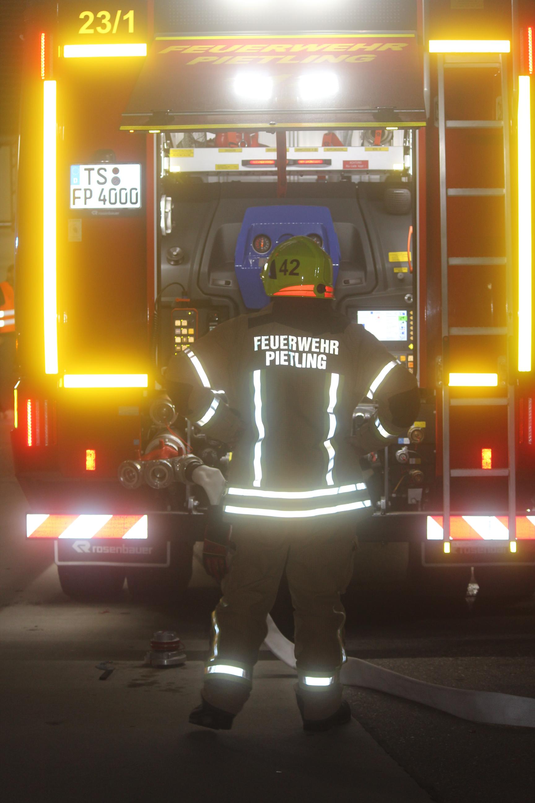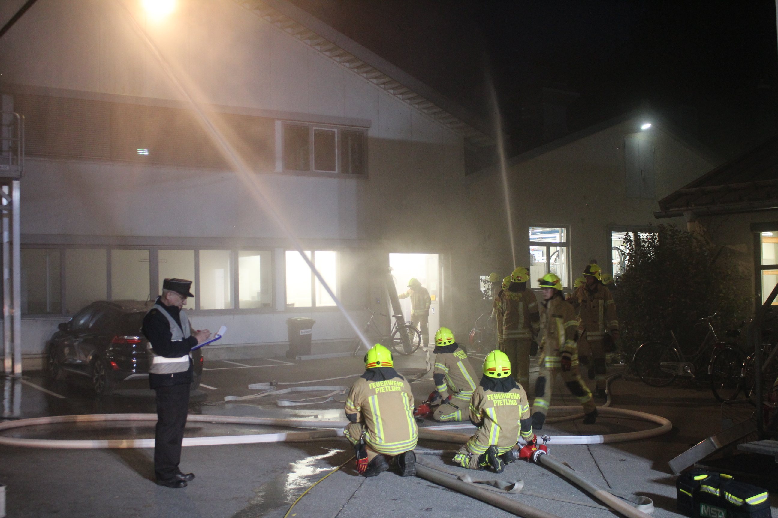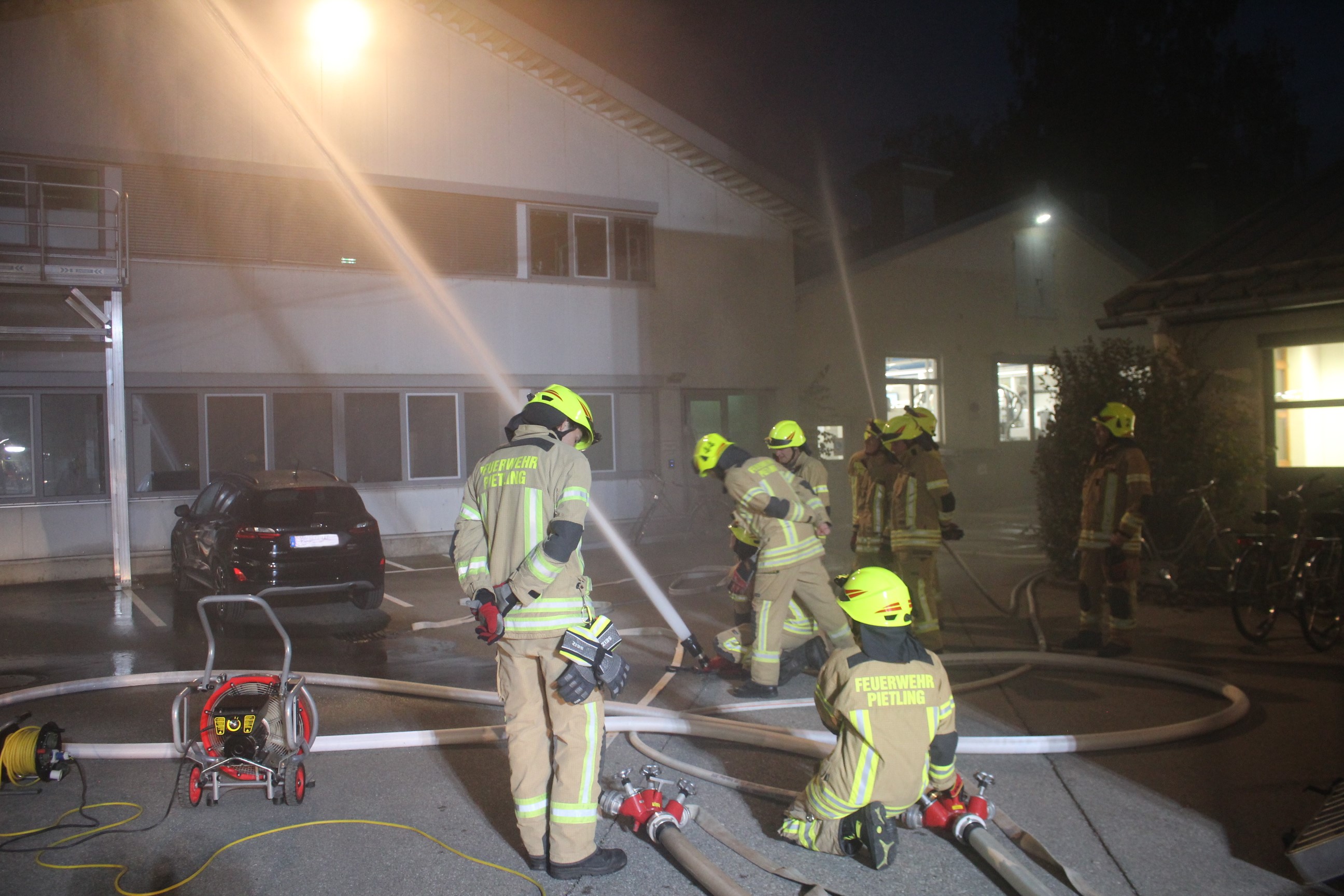 Rund 160 Floriansjünger übten gemeinsam und prüften damit die Brandschutzeinrichtungen und Sicherheitsvorkehrungen des Unternehmens. Wenige Minuten nach dem Brandalarm war die Feuerwehr Pietling, in deren Zuständigkeitsbereich sich das Rosenberger-Werksgelände befindet, am gemeldeten Brandort. 1. Kommandant Hans Schild und die Gruppenführer machten sich sofort auf den Weg zur Halle, in der der Brandalarm gemeldet wurde. Brandrauch (künstlich mit einer Nebelmaschine erzeugt), machte deutlich, dass es zu einem Brand gekommen war. Das Übungsdrehbuch gab vor, dass sich das Feuer schnell ausgebreitet hat und die Halle, in der sich die Elektrowerkstatt befindet, großflächig brennt. Einsatzleiter Schild veranlasste umgehend eine Alarmstufenerhöhung und forderte weitere Feuerwehren an: „B 5 – Brand Industrieanlage“ – so die Meldung für die Feuerwehren Fridolfing, Kirchheim, Törring und Tittmoning. Umgehend positionierten sich die Löschmannschaften rund um das brennende Gebäude, begannen mit den Löscharbeiten und legten ihr Augenmerk darauf benachbarte Werkshallen vor einem Übergreifen der Flammen zu schützen und eine Ausdehnung des Brandes zu verhindern. Dazu wurde eine sogenannte Riegelstellung mit Wasserwerfern und Wasserwand aufgebaut. Neben den Löschtrupps „am Boden“ wurden auch zwei Drehleitern in Stellung gebracht, um aus der Höhe löschen zu können. Um die Wasserversorgung sicher zustellen wurden neben den Hydranten auf dem Werkgelände auch lange Schlauchleitungen von einer etwas weiter entfernten Zisterne zum vermeintlichen Brandort verlegt.