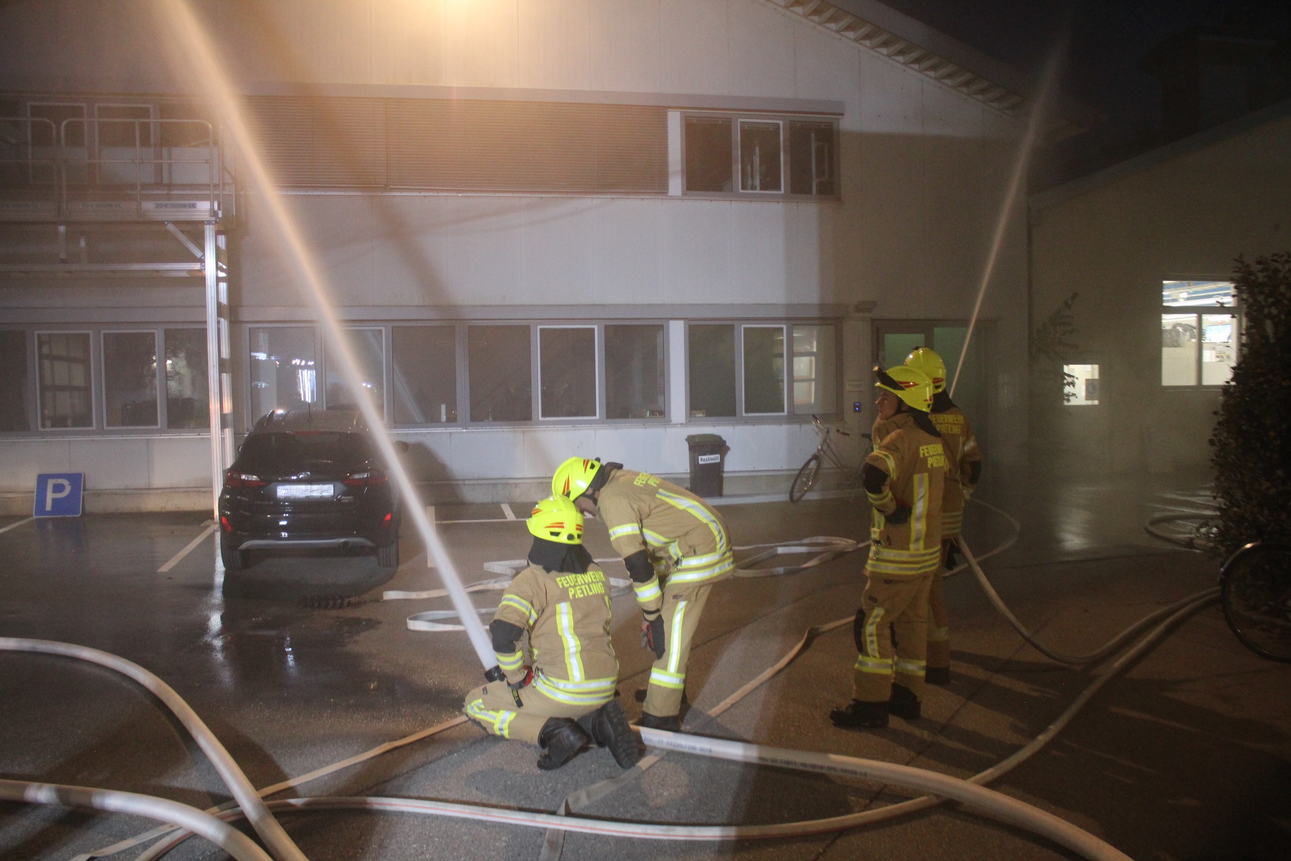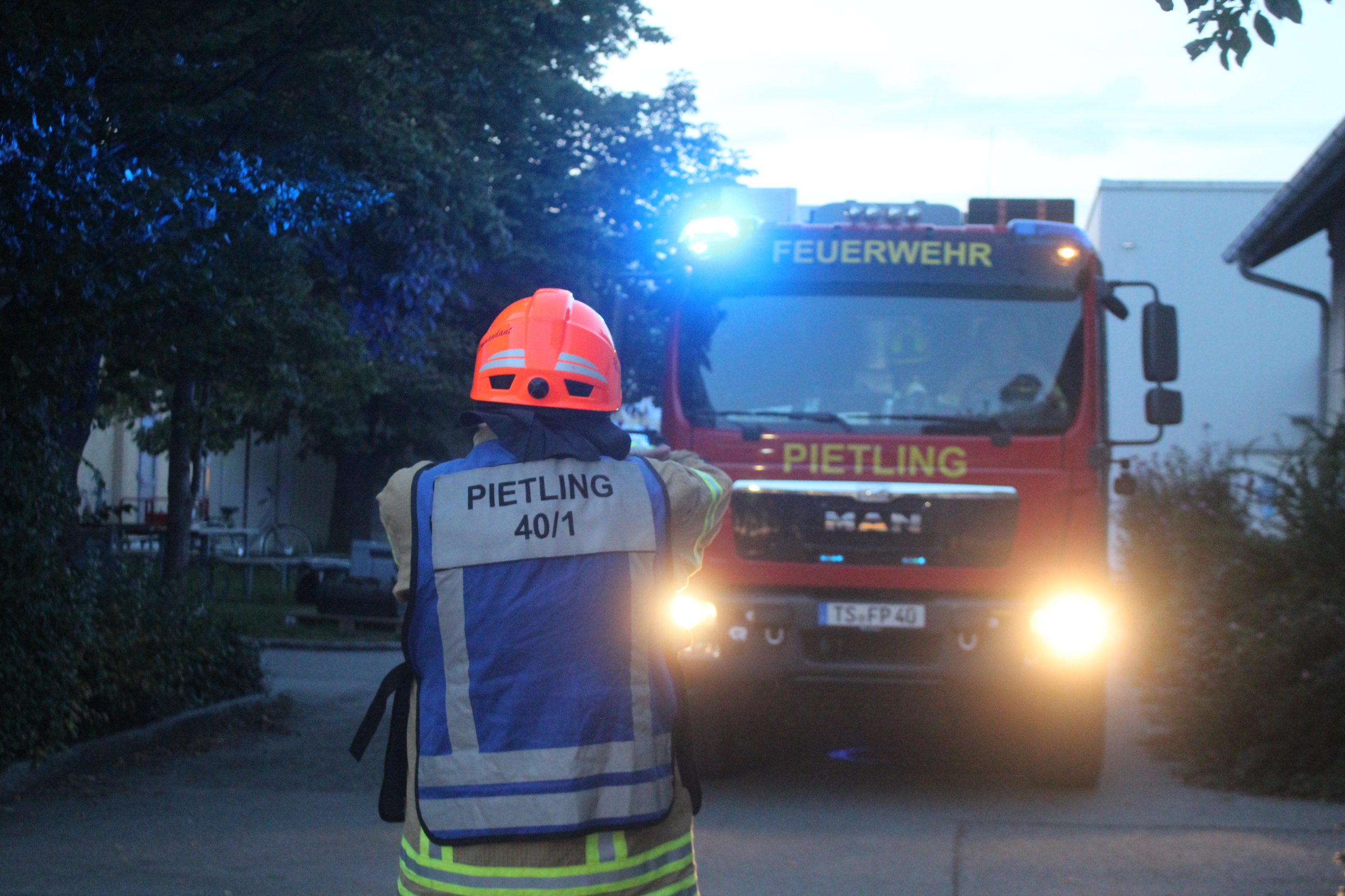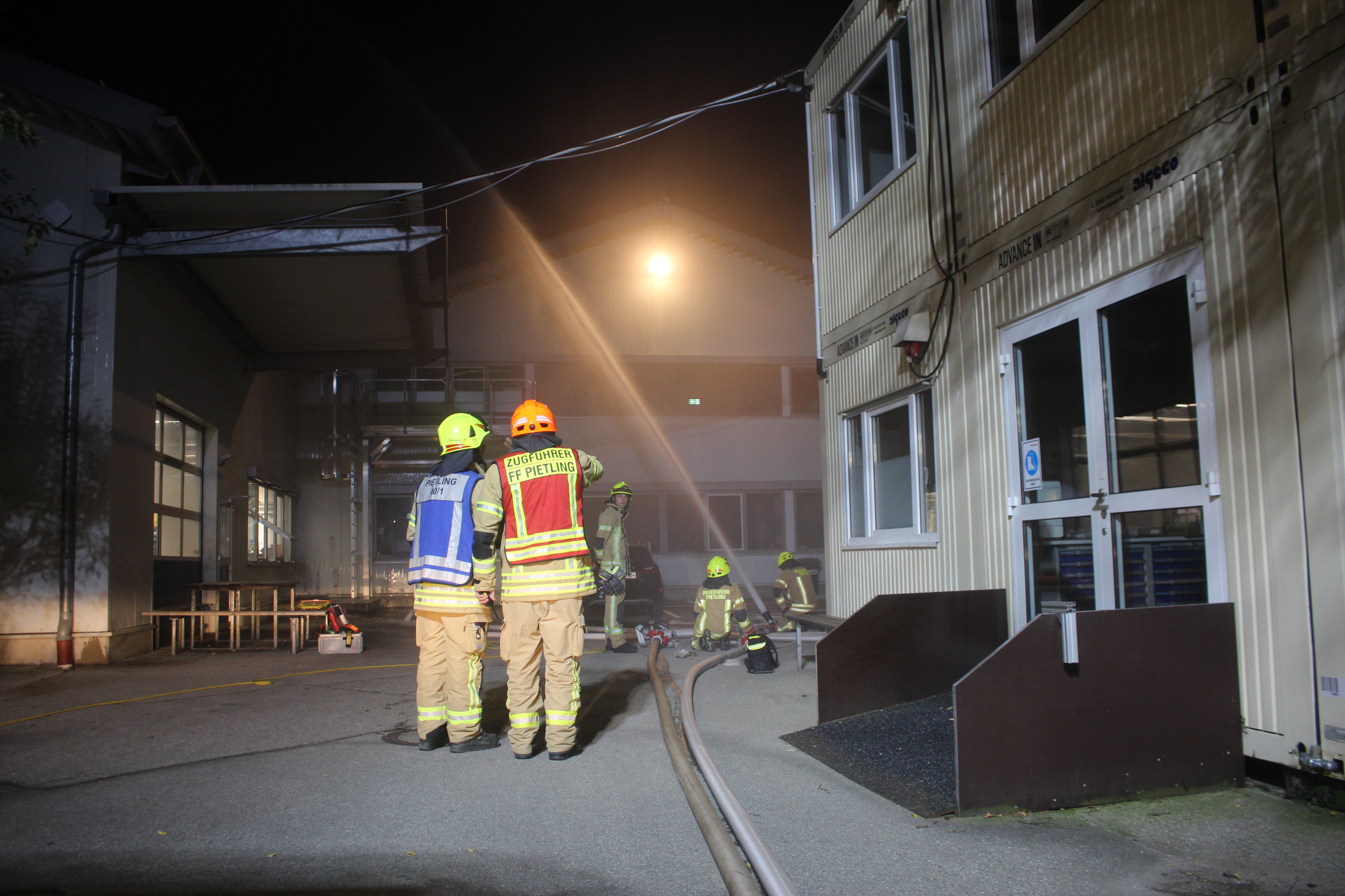 Rund 160 Floriansjünger übten gemeinsam und prüften damit die Brandschutzeinrichtungen und Sicherheitsvorkehrungen des Unternehmens. Wenige Minuten nach dem Brandalarm war die Feuerwehr Pietling, in deren Zuständigkeitsbereich sich das Rosenberger-Werksgelände befindet, am gemeldeten Brandort. 1. Kommandant Hans Schild und die Gruppenführer machten sich sofort auf den Weg zur Halle, in der der Brandalarm gemeldet wurde. Brandrauch (künstlich mit einer Nebelmaschine erzeugt), machte deutlich, dass es zu einem Brand gekommen war. Das Übungsdrehbuch gab vor, dass sich das Feuer schnell ausgebreitet hat und die Halle, in der sich die Elektrowerkstatt befindet, großflächig brennt. Einsatzleiter Schild veranlasste umgehend eine Alarmstufenerhöhung und forderte weitere Feuerwehren an: „B 5 – Brand Industrieanlage“ – so die Meldung für die Feuerwehren Fridolfing, Kirchheim, Törring und Tittmoning. Umgehend positionierten sich die Löschmannschaften rund um das brennende Gebäude, begannen mit den Löscharbeiten und legten ihr Augenmerk darauf benachbarte Werkshallen vor einem Übergreifen der Flammen zu schützen und eine Ausdehnung des Brandes zu verhindern. Dazu wurde eine sogenannte Riegelstellung mit Wasserwerfern und Wasserwand aufgebaut. Neben den Löschtrupps „am Boden“ wurden auch zwei Drehleitern in Stellung gebracht, um aus der Höhe löschen zu können. Um die Wasserversorgung sicher zustellen wurden neben den Hydranten auf dem Werkgelände auch lange Schlauchleitungen von einer etwas weiter entfernten Zisterne zum vermeintlichen Brandort verlegt.