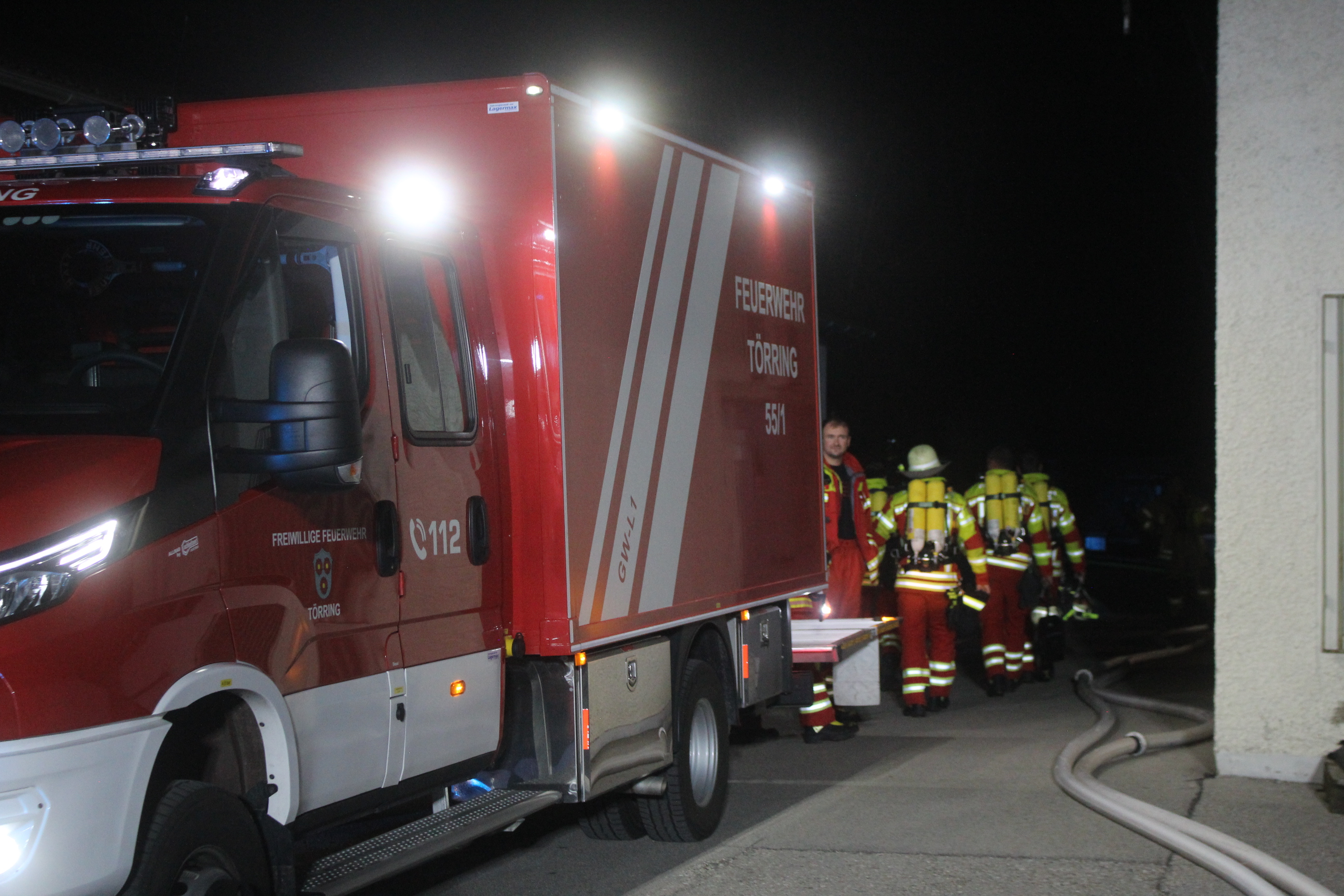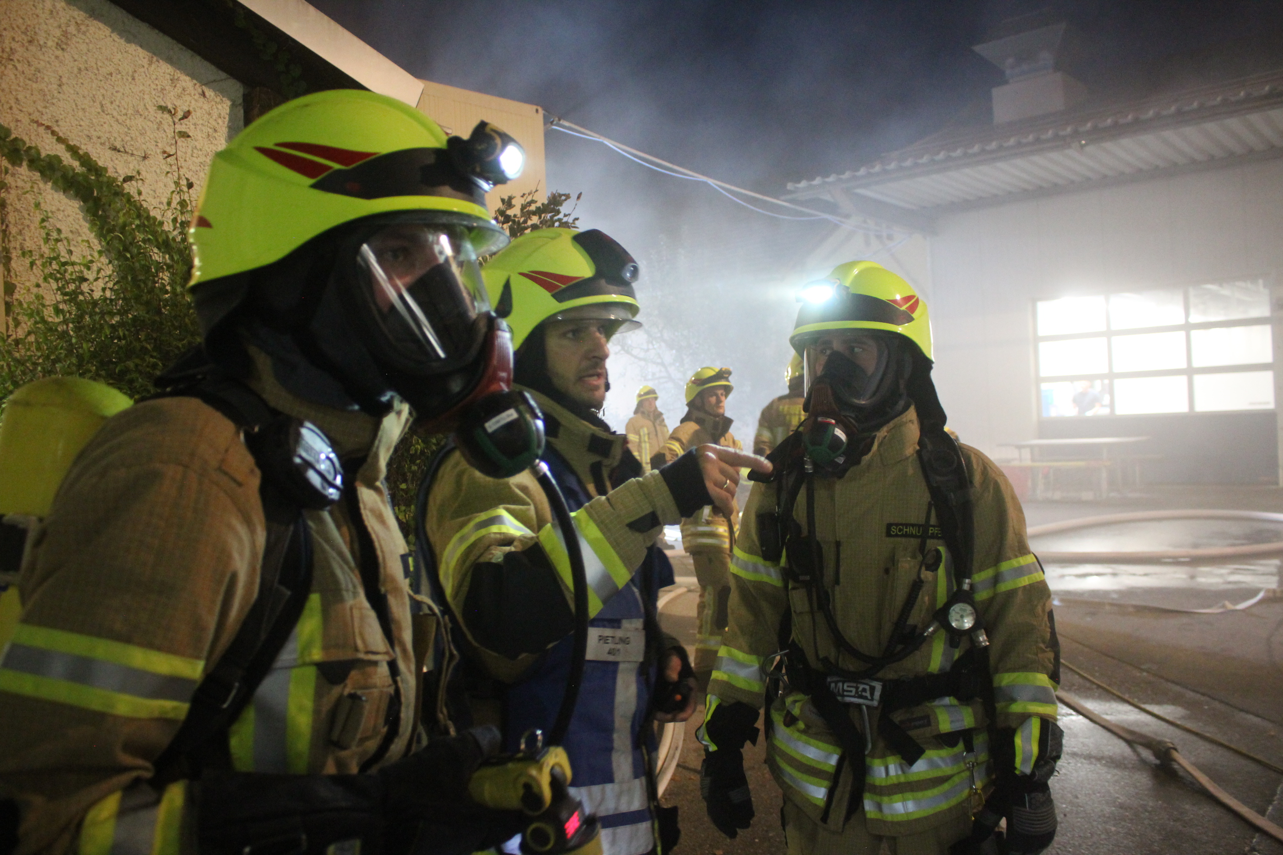 Vorrang hat jedoch die Menschenrettung. Parallel zum Löscheinsatz rüsteten sich zahlreiche Trupps mit Atemschutzgeräten aus und rückten in die verrauchten Hallen vor und durchsuchten diese nach Personen, die vermisst, verletzt oder sich wegen des Brandrauchs nicht selbständig aus dem Gebäude und in Sicherheit bringen konnten. Die intensive Absuche, Raum für Raum, hatte schnell Erfolg. Zwei Personen konnten nach kurzer Zeit gerettet werden. Außer den Wehren, die sich auf die Menschenrettung und das Löschen des Brandes konzentrierten, wurden auch der Mess-Zug Süd, mit Kräften der Feuerwehren der Stadt Traunstein alarmiert und zum Brandort beordert. Die Spezialeinheit führte im näheren Umfeld um die Brandstelle Schadstoffmessungen in der Luft durch, um festzustellen, ob der Brandrauch eine gesundheitliche Gefahr für die Bevölkerung darstellt. Fingiert geübt wurde ebenso die Bewarnung der Anwohner im näheren Umfeld, durch Lautsprecherdurchsagen. Diese Aufgabe wurde von den Kräften der Feuerwehren Kay, Kirchanschöring und Petting erledigt. Im Ernstfall wird dies auch durch Rundfunkdurchsagen unterstützt.