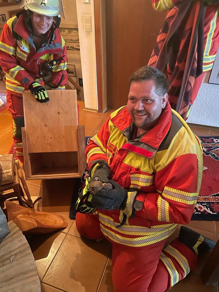 Einsatzort war die Lutzengasse mitten in der historischen Tittmoninger Altstadt. Sechs Einsatzkräfte machten sich nach der Alarmierung umgehend mit der Drehleiter und dem Tanklöschfahrzeug auf den Weg zum Einsatzort. „Das Tanklöschfahrzeug haben wir benötigt, weil wir auf diesem Fahrzeug diverses technisches Rettungsmaterial mitführen“, informiert 1. Kommandant Erwin Hirschpoltner im Gespräch mit der Pressestelle des Kreisfeuerwehrverbandes Traunstein. Als Glücksfall stellte sich bei dem Einsatz heraus, dass der Aktiven Chef neben seinem Engagement bei der Feuerwehr auch ausgebildeter Jäger ist und somit im Umgang mit Tieren bestens vertraut war.