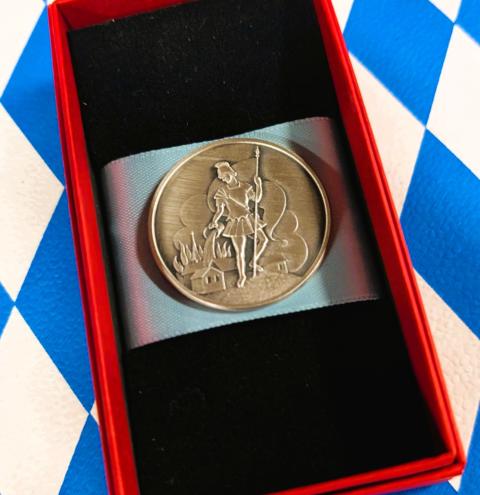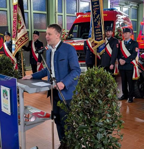 Stellvertretend für den Kreisfeuerwehrverband überbrachte die Glückwünsche der Feuerwehren des Landkreises Traunstein Kreisbrandinspektor Martin Schupfner, der gemeinsam mit Kreisbrandmeister Albert Rieder an der Feierstunde teilnahm. Er dankte den Städten und Gemeinden für die Ausstattung und den Unterhalt der Feuerwehren und wünschte den Aktiven stets eine gesunde Rückkehr von Einsätzen und Übungen. Als kleines Zeichen der Wertschätzung überreichte er „Floriansmedaillen“ als Glücksbringer für die neuen Fahrzeuge.