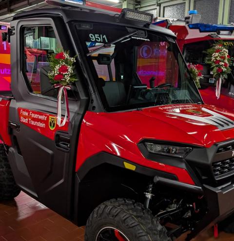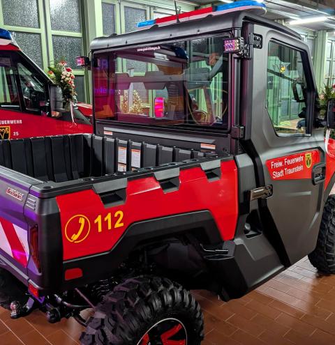 Die offene Ladefläche gewährleistet eine sichere Schwarz-Weiß-Trennung kontaminierter Einsatzmittel und verbessert damit die Einsatzhygiene. Vorgesehen ist der Einsatz bei Veranstaltungen im Stadtgebiet sowie auf Wander- und Radwegen entlang der Traun, wo die geringe Breite und hohe Geländegängigkeit klare Vorteile bieten. Finanziert wurde das ATV vollständig aus Spendenmitteln durch den Feuerwehrverein.