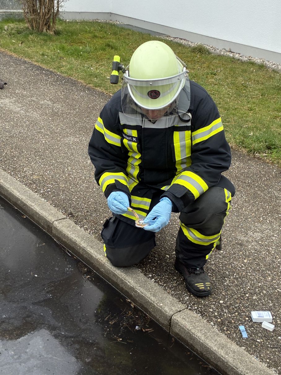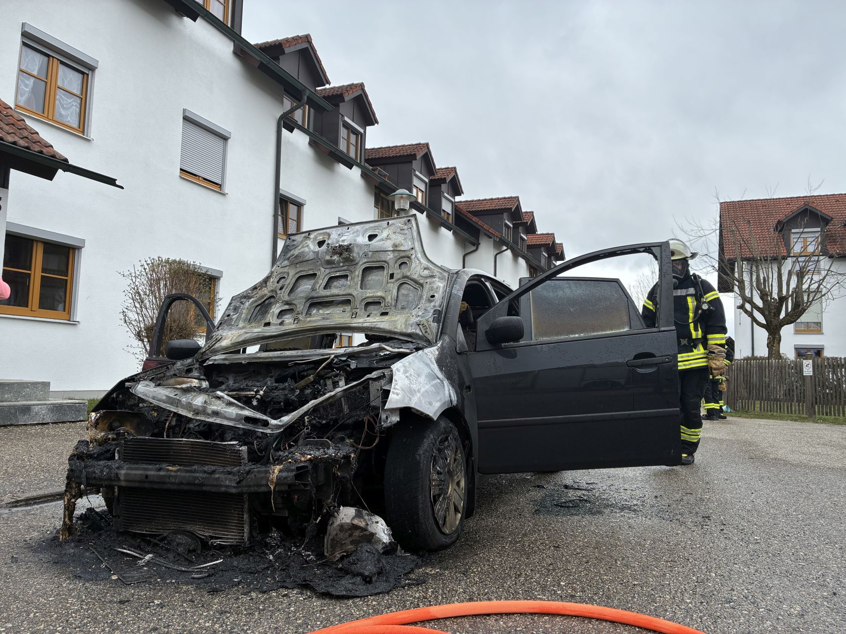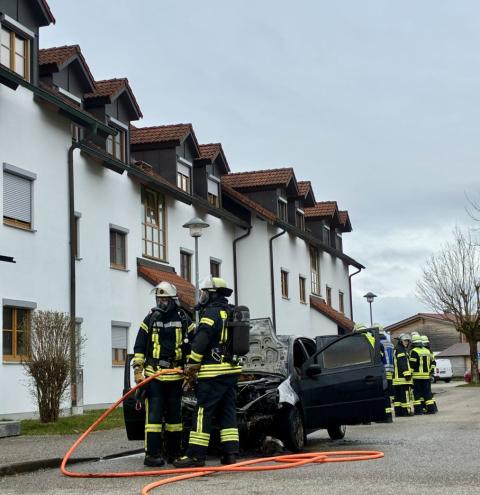 Die Feuerwehr Tacherting wurde zu einem Brand eines Pkw an einem Gebäude in der Tagahartstraße in Tacherting alarmiert. Das Fahrzeug befand sich etwa zwei Meter vom Hauseingang entfernt. Die Fahrzeughalterin war auf dem Weg zu Angehörigen in die Tagahartstraße, als sie bei ihrer Ankunft Rauch aus dem Armaturenbrett bemerkte. Sie verließ daraufhin umgehend das Fahrzeug. Beim Eintreffen der Einsatzkräfte stand der PKW bereits in Vollbrand. Der Brand wurde unter anderem mit Schaum gelöscht. Zudem wurde das Löschwasser kontrolliert zurückgehalten, um ein Eindringen in die Kanalisation zu verhindern. Ausgetretene Betriebsstoffe wie Öl und Kraftstoff mussten teilweise gebunden werden. Neben der Feuerwehr Tacherting war auch die Feuerwehr Trostberg alarmiert, deren Unterstützung jedoch nicht erforderlich war. Die Feuerwehr Tacherting rückte mit vier Fahrzeugen und rund 20 Einsatzkräften aus. Ebenfalls vor Ort waren eine Polizeistreife und der Rettungsdienst. Der Einsatz dauerte etwa eineinhalb Stunden.