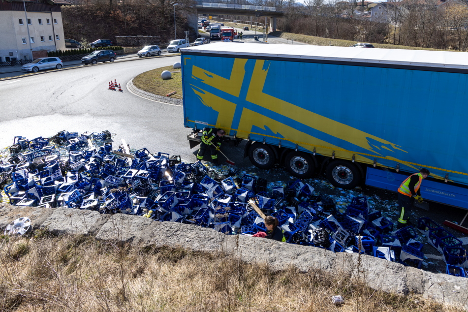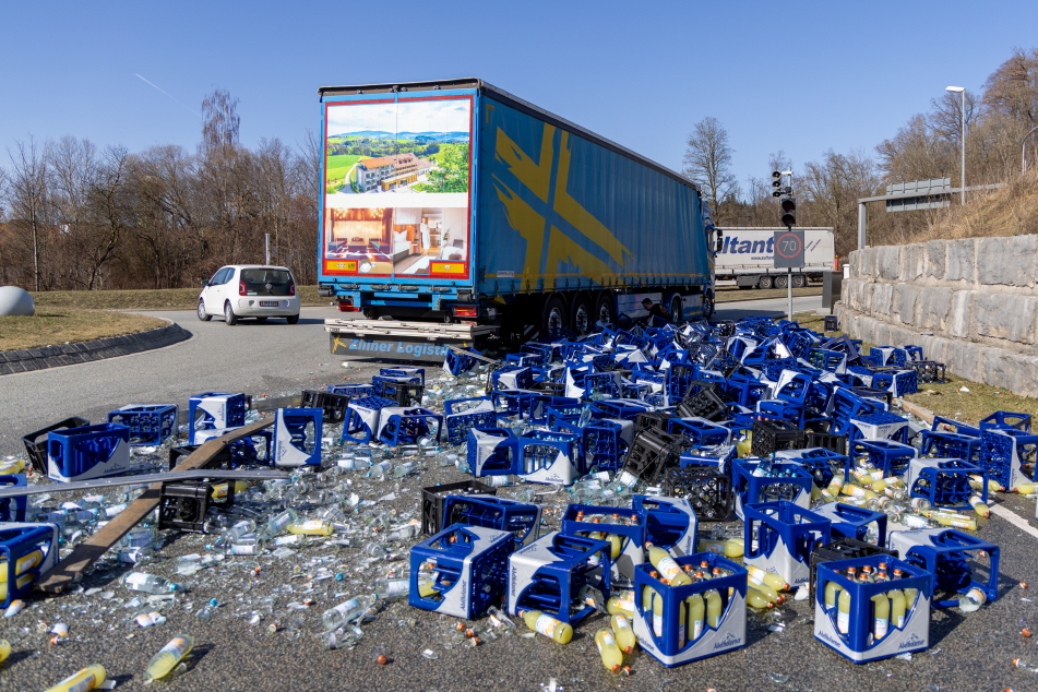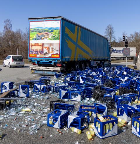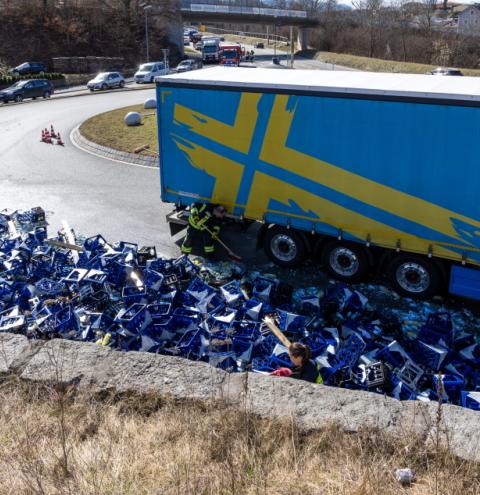 Am Kreisverkehr des Ettendorfer Tunnels in Traunstein ereignete sich ein Verkehrsunfall, der den Verkehr rund um Traunstein massiv behinderte. Ein mit Getränkekisten beladener LKW, der unterwegs aus Traunstein kommend in Richtung Altötting war, verlor aufgrund nicht angepasster Geschwindigkeit im Kreisverkehr einen Teil seiner Ladung. Diese stürzte auf die Straße und in den Grünstreifen neben dem Kreisverkehr. Verletzt wurde bei dem Unfall niemand. Zunächst war die Feuerwehr aus Traunstein mit 20 Einsatzkräften zur Verkehrsregelung und Säuberung der Unfallstelle vor Ort. Da der LKW umgeladen werden musste, wurden die Wehren aus Teisendorf, Surberg und Haslach sowie das THW nachalarmiert. Während der Aufräumarbeiten wird der Kreisverkehr vermutlich komplett gesperrt werden müssen. Die Polizei aus Traunstein hat den Unfall aufgenommen.